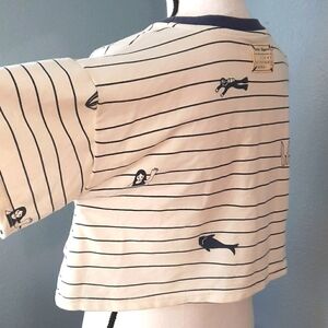 GUC Measurements Provided Cream & Navy Kitschy Pattern Boxy cut Adorable! Bust:20" Length:15" *see pic for flaw priced accordingly