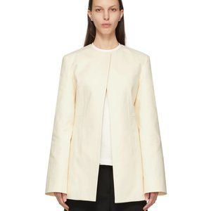 Long sleeve cotton piqué jacket in off-white. Concealed button fastening at crewneck collar. Open front. Darts at front and back. Tonal stretch viscose satin lining. Fully lined. Logo-engraved tortoiseshell hardware.