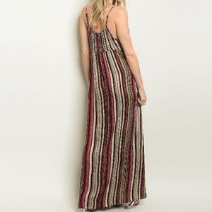 Cotton Tie Front Maxi Spaghetti Strap Print Dress. Lightweight cotton breathable summer maxi dress. Slender strap flow to a smocked elastic racer-back. Self-tie front keyhole bust. Sleeveless multi color stripe print.