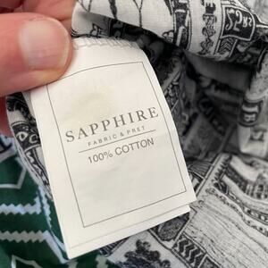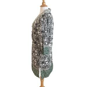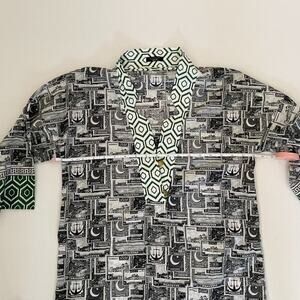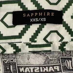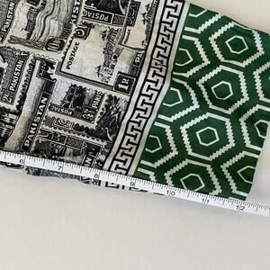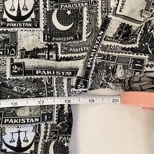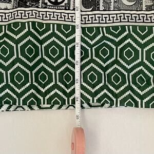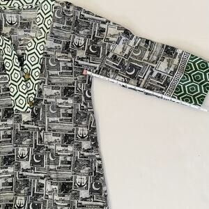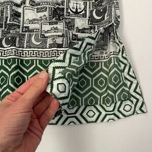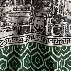 Black and White Pakistan postage stamps, paired with green geometric trim on cuffs, neck and hem.