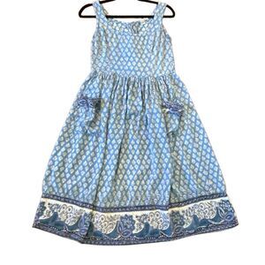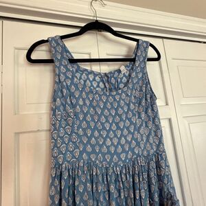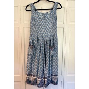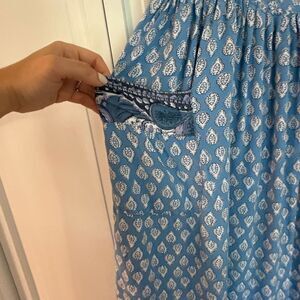 Description: cotton square neck block print dress with button back and pockets with contrast print