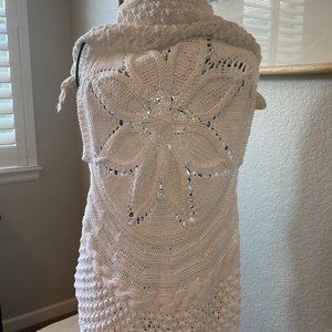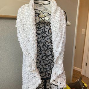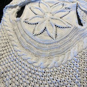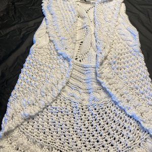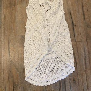 This is gorgeous, but not my size! Bright white Cotton by Autumn Cashmere (the summer line of Autumn Cashmere) open drapey cardigan. Super soft cotton crochet style sleeveless sweater. Front has drapey shawl collar and a scalloped hem, back has a beautiful flower in the crochet. Perfect for late spring summer with jeans or shorts.
