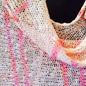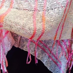 Crotchet knit light pink poncho with hot pink satin stripes interwoven with fringe🎀 wear this layered on a cool night and transition this piece into Fall!💕 made of cotton and rayon. One size.
