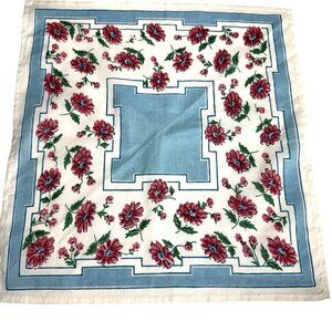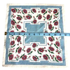 Cotton handkerchief hankie 13 in. by 12-1/4 in. White, Blue with Pink Flowers