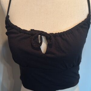 black crop top with spaghetti straps and a front tie detail. The tie will adjust the length of the strap. Perfect for casual outings. Great for layering