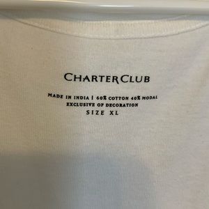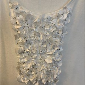 Sleeveless, white shell with beautiful petal-like embellishment at scooped neckline.