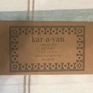 Cotton tablecloth with tan and green woven stripes from Pakistan