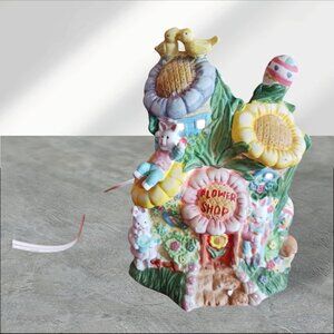 This intricately designed hand-painted porcelain figurine by Cottontale Cottages depicts a charming bunny flower shop. The lighted feature adds a warm glow, making it an inviting decor piece for any room. Its artistic craftsmanship and vibrant colors are sure to enhance any collectibles display.is in great condition from smoke and pet free home