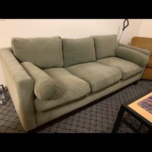 8 ft, super comfy, cotton, beautiful green couch. I’ve had it for about 6 months. I live in a small apartment and it fits perfectly in my living room.