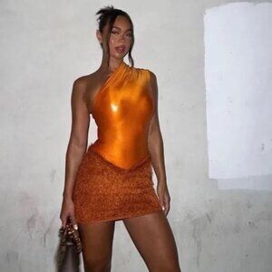 Mini skirt in Anemone orange, in an innovative fringed, shaggy fabric. Cut to wrap curves and refine waist.