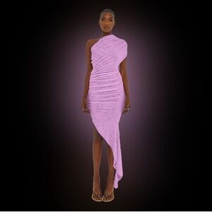 •Asymmetric dress in Yam. Innovative, slinky material. Stretches, ruches and drapes across your contours. Unfinished edges for a deconstructed look.