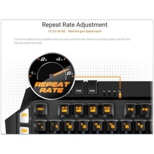 The 500K FPS Gaming Keyboard is a membrane switch keyboard, and it has a 32-bit ARM Cortex-M0 chip inside. It promises N-key rollover (supported over USB) and, non-RGB/ regular backlighting, which you can tweak in the UIX software. The polling rate is 1000 MHz / 1 ms, and it promises a repeat rate of 1x / 2x / 4x / 8x. There's a pair of gold-plated USB connectors and a pass-through USB port on the upper-right side for a mouse. The 1.8-meter cable is braided.