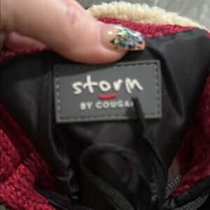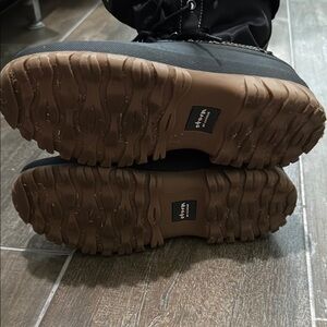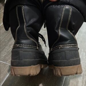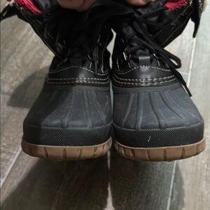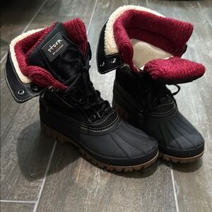 Warm and durable winter boots. Black exterior with burgundy lining. Ideal for cold weather.