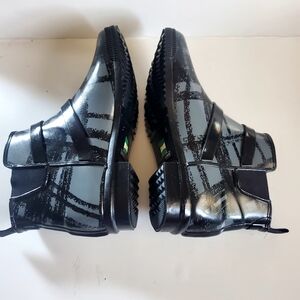 Sleek rain boots with a stylish plaid design. Durable and waterproof. Ideal for wet weather.