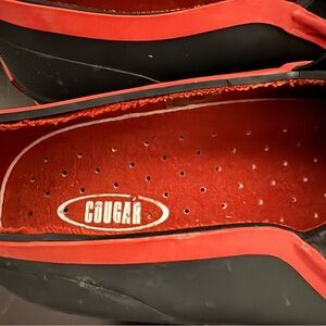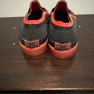 Sleek black ankle boots with vibrant red accents. Slip-on design. Durable and stylish.