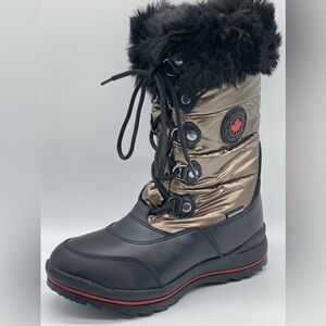 Stay cozy and stylish in these Cougar Canada quilted winter boots with faux fur lining. Designed in a striking metallic gold, black, and red colorway, these boots are waterproof, durable, and built for warmth—perfect for snowy days and cold weather adventures.