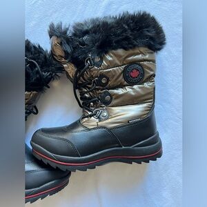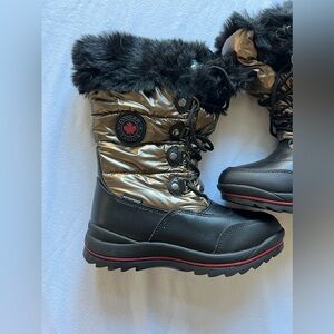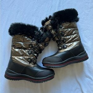 Cougar winter boots, faux fur boots, waterproof snow boots, quilted boots, metallic gold boots, warm winter shoes, Canada boots, cozy boots, ski trip boots, cold weather footwear, stylish winter boots.