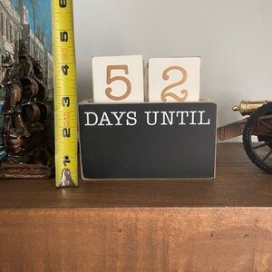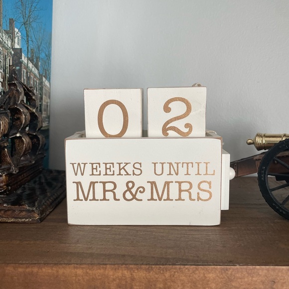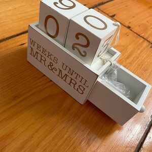 Charming countdown block calendar with 'Weeks Until MR & MRS' text. Features interchangeable number blocks.
