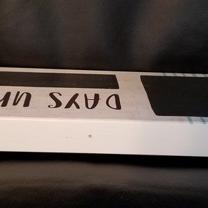 Super cute shabby chic "Days Until" chalkboard sign. Write your own countdown on it (vacation? retirement? wedding?) and display it on a wall, shelf, or desk. The sign is lightly distressed white with aqua stripes. In like-new condition; this is a distressed item, so will have intentional imperfections. It still has the original tag on the back. Chalk not guaranteed to be included. 12" L x5.25" H x1.25" D