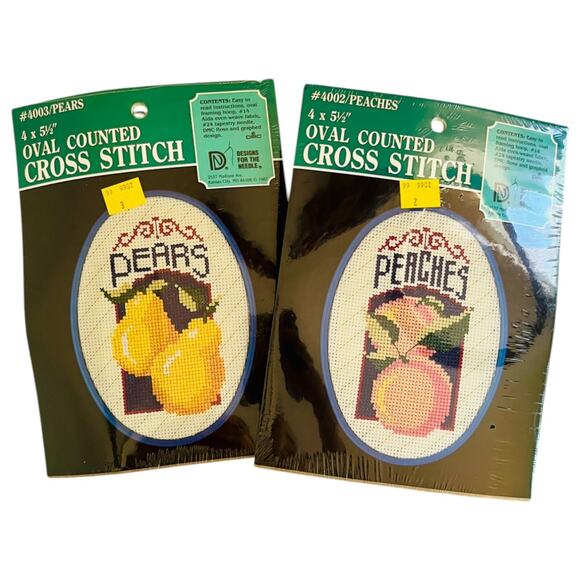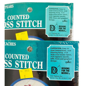 Counted Cross Stitch Kits Lot of 2 Pears Peaches Fruit Frame Hoop New Sealed NOS