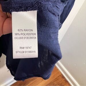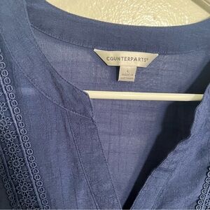 Great condition. Counterparts. Split neck tunic blouse. Navy blue. Eyelet lace details. 3/4 sleeve. Semi-sheer. Style 911990HA. Size Large. Pit to pit laying flat 21” shoulder to hem 25” sleeve (shoulder seam to hem) 20”. All measurements are approximate and taken lying flat. Smoke free home. No trades, offers welcome.