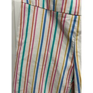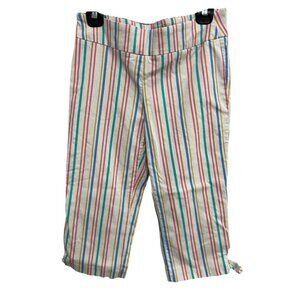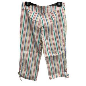 Stylish women's capri pants with multi-colored vertical stripes. Features include a cropped fit, side ties at the hem, and a comfortable rayon blend fabric. Size 10P.