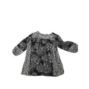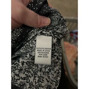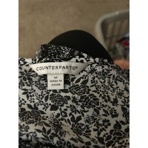 This women's blouse by Counterparts is a basic style with a V-neck and 3/4 sleeves. It features a multicolor floral pattern and is made from lightweight polyester. The blouse is a Size M, manufactured in China, and is pre-owned. Color: Black.