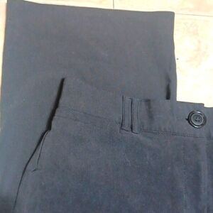 these are a pair of black trouser pants by counterparts they have an inner stretch on the waistband not a full stretch but an inner for comfort they have the slit front pockets that are sown but if you want to use them you can just clip the stitches cuz they are there inside the pants they've got back pockets that a faux pockets they got the belt loops and then they've got the looser wider legs a really comfortable pair of pants for sure they're made from 63% polyester 33% rayon and they have 4% spandex there are size 8 the measurements are approximately lying flat the waist is 15 in the inseam is 29 in and the rise is 12 in so they are a high-waisted loose wide legged at the bottom in excellent condition
