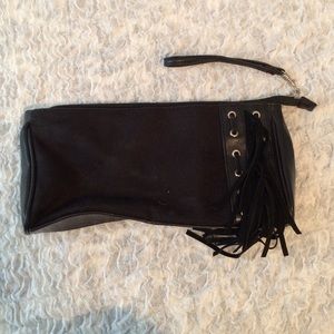 Black suede and fringed wristlet. In like new condition with zipper closure. Also has inside zipper compartment for IDs/money and cellphone pouch on opposite side. Great for casual and day time fun.