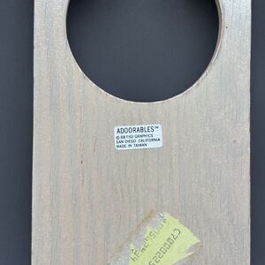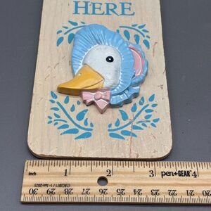Vintage 1988 Figi Graphics ADoorables wooden door hanger featuring a raised resin goose head in a blue bonnet and pink bow. The sign reads Friends Gather Here in blue lettering on a solid blue background with leaf accents. This piece reflects the popular 1980s country farmhouse and goose kitchen décor style. Some surface wear and minor paint chipping/scratches consistent with age. See photos for measurements and condition details.