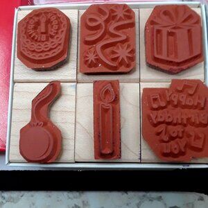 Happy birthday stamp set from 2004 by Hero Arts. Set has six stamps about 1.5 inches long consists of candle, cake, present, happy birthday to you, balloon and confetti stamps.