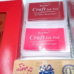Set consists of 7 stamps, decals, and washable ink pad red in color.