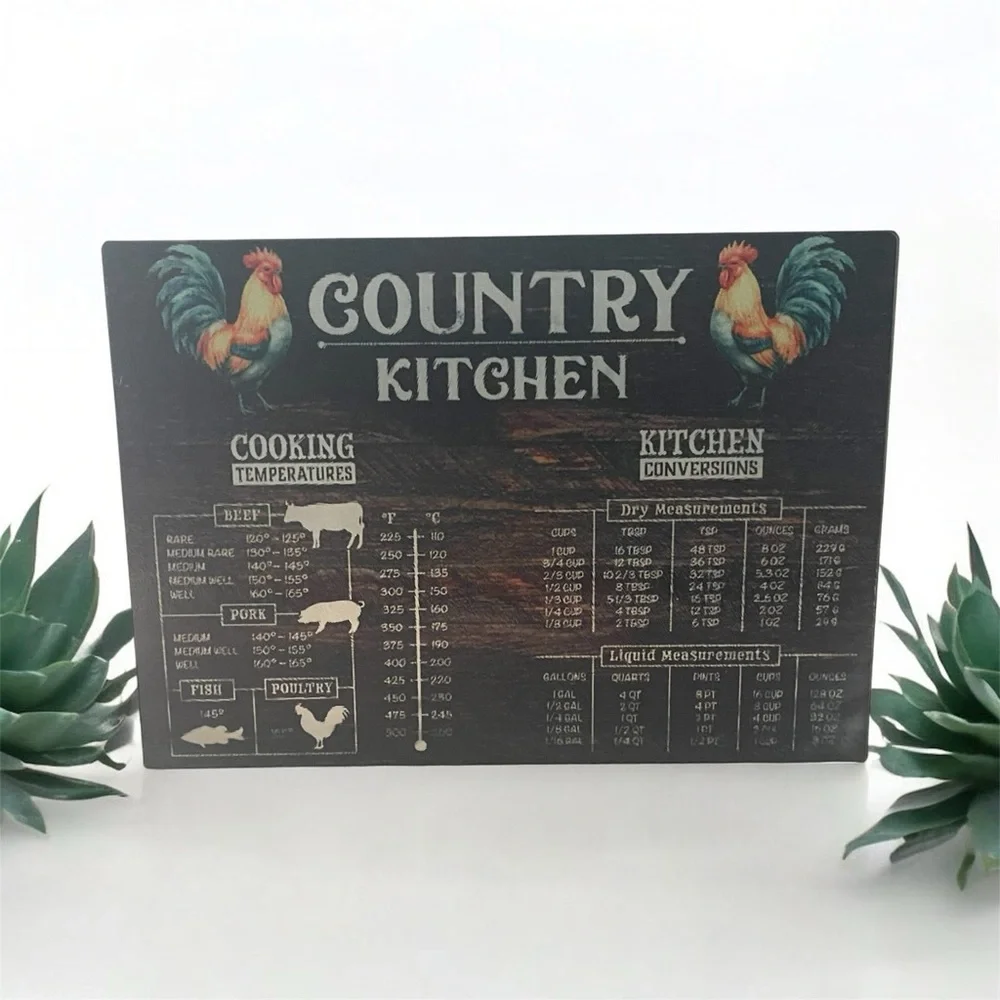 Enhance your kitchen with this charming Country Kitchen conversion chart 8x11 glass cutting board. Featuring a rustic black background with colorful rooster accents, it's both decorative and functional. Perfect for any cooking enthusiast.