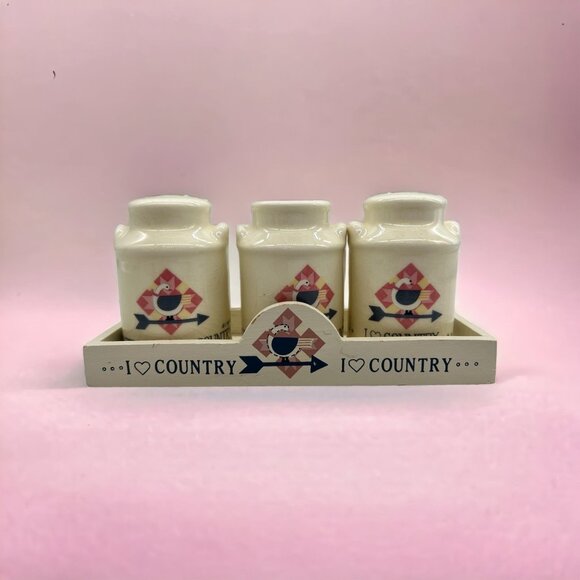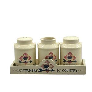 Charming "I Love Country" goose-themed salt and pepper shaker and toothpick holder by Berco. Perfect for country-themed kitchens and collectors.