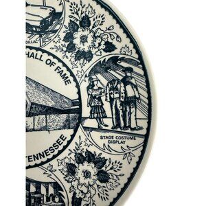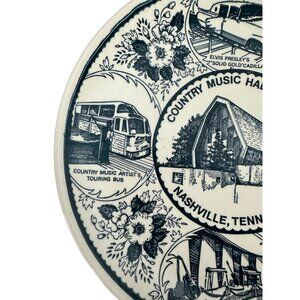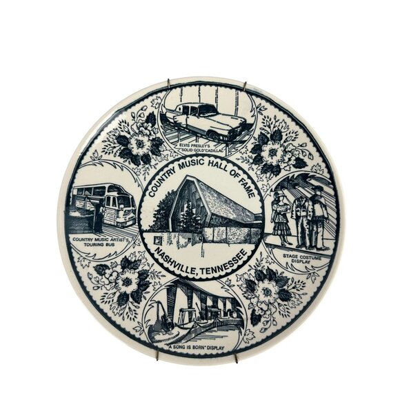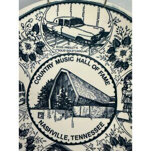 This vintage 10-inch ceramic plate features intricate blue-toned illustrations of the Country Music Hall of Fame in Nashville, Tennessee. Highlighting classic exhibits such as Elvis Presley's car, stage costumes, and historic country music displays, this decorative piece preserves the charm of country music heritage. Excellent vintage condition.