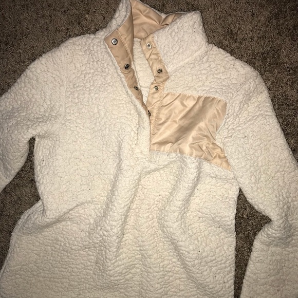 White fuzz, tan pocket long sleeve sweater