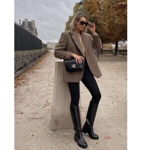 Elegant in silhouette and crafted with care, these black leather riding boots from Country Road walk the line between timeless utility and quiet luxury. Known for refined, minimalist staples and elevated everyday design, the beloved Australian label delivers here with a structured round toe, sleek shaft, and silver-tone buckles that echo classic equestrian styling.
