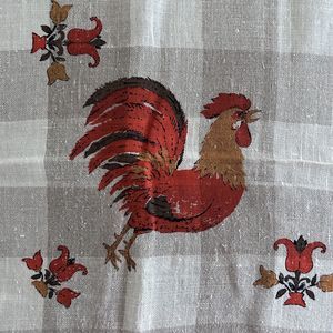 Beautiful French country linen blend table cloth. Bright, vibrant roosters on a neutral Buffalo check background. Roosters are red, orange, gold and brown.