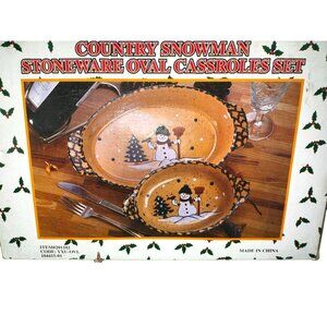 Country Snowman Stoneware Oval Casserole Set