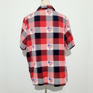 This product is a patriotic-themed 4th of July shirt for women in size 1X. Made of 100% cotton with a multicolor design featuring red, white, and blue hearts, this vintage-style button-up is perfect for casual occasions. The regular fit and short sleeves make it comfortable and stylish for a patriotic look.