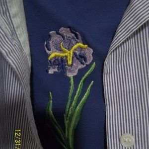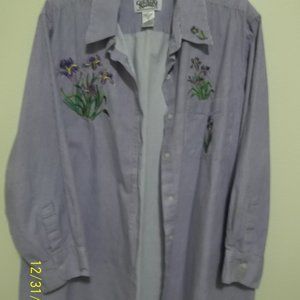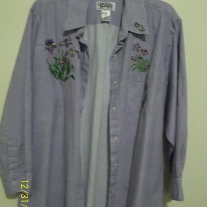 Two Piece Button Up/Matching Tee Purple w/Iris Motif Size 1X, cute emrodered Iris on shirt, patch front pocket, long sleeve button cuff, cotton, machine wash