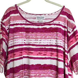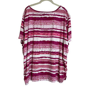 Country Store Women's Short Sleeve Tee Size 3X Pink White Mixed Stripes Cotton Blend Ruched Sides