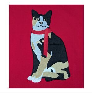 How fun is this cozy red pullover sweatshirt by Country Store! It features an embroidered applique of a calico cat in a red scarf, sitting tall and proud. The sweatshirt has black and white buffalo check trim at the collar, cuffs and hem for a layered look. Inside is a soft fleece lining. The sweatshirt is about mid-weight with some stretch. There are side slits at the hem and cuffs. It looks to be a tunic style, so would probably look really cute even over a simple pair of leggings.