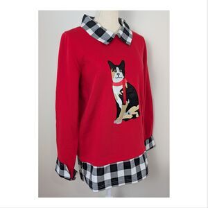 Country Store Womens Sweatshirt Small Embroidered Cat Layered Look Buffalo Check Plaid Red Fleece Pullover Long Sleeve