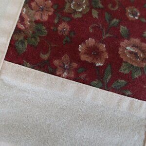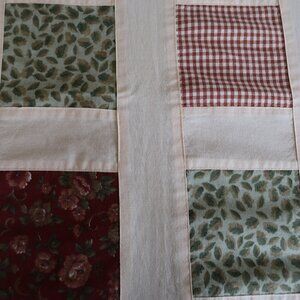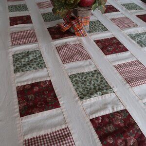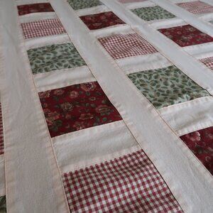 Color blocks are in colors of green and barn red on ecru strips; blocks are stitched into the cloth, like a quilt top without the backer