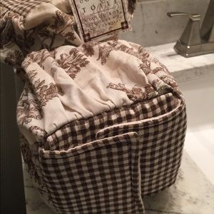 Set of two toile and check print tissue box covers. They’ve never been used and have been in storage. There is smudging is places apparently from handling & would recommend hand wash & dry before use. The most noticeable smudge is shown in last photo. The top and bottom (check print material is padded).