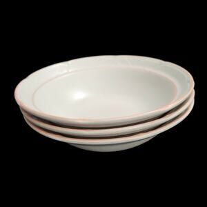 Each bowl features a smooth white glaze with a soft peach band and embossed rim detail — a simple, classic design ideal for everyday or country cottage table settings.