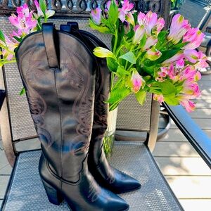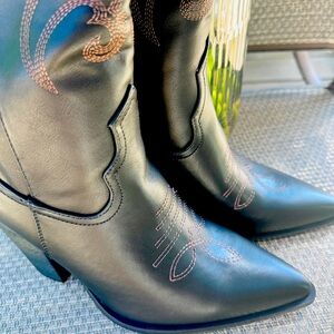 The centerpiece of any country western outfit! Cowboy boots with pointed toes and a classic heel provide the perfect blend of style and function: subtle inlays and stitching. That add a touch of character to this sleek chic boot. Plush feel. Non leather. NEW.