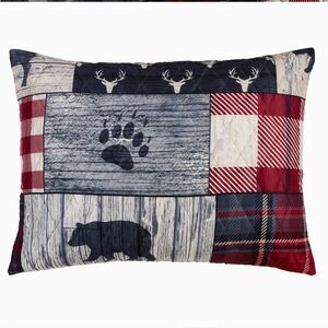 New in bag! Mountain Trails colorful, quilted 3-piece reversible microfiber bedding ensemble features a series of outdoor motifs, plaid and geometric elements arranged in a patchwork pattern. The colors are dark charcoal, medium grey, soft light grey, white and red. Reverses to a beautiful stripe pattern. You'll love this easy care, ultra soft bedding set! Sham images may vary. Cover: 100% Polyester Fill: 100% Polyester Fiber. Set includes one king size quilt and two king pillow shams