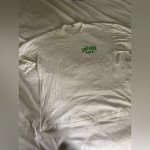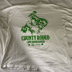 Lone Rider Ranch T-shirt: White t-shirt with green County Rodeo graphic. Features a cowboy and horse design.